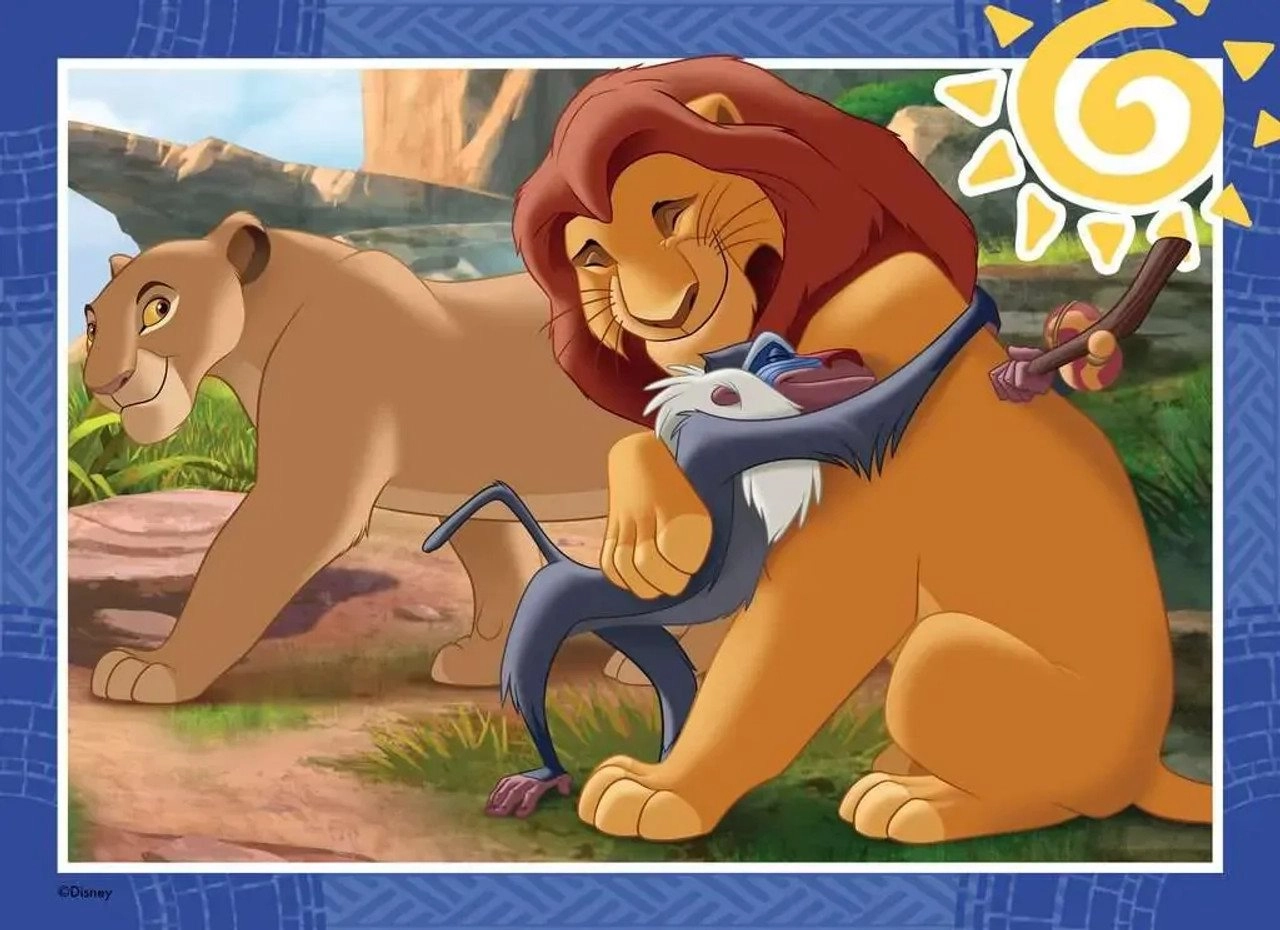 Ciesz się zabawą dla dzieci i rodziców z wysokiej jakości puzzlami RAVENSBURGER ze świata DISNEY: Król Lew. Zestaw zawiera 4 puzzle po 42 elementy o tych samych wymiarach, które rozwijają cierpliwość, małą motorykę i logiczne myślenie. Po ułożeniu każdy obrazek ma ok. 36 × 26 cm.