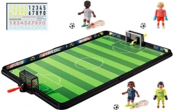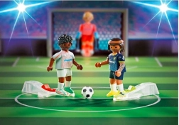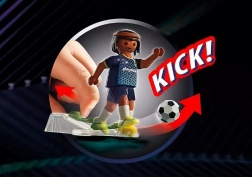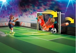 Rozłóż składaną arenę, ustaw drużyny i rozpocznij mecz! Ten zestaw z linii PLAYMOBIL Sports & Action zapewnia dynamiczną rozgrywkę z świetnymi elementami zabawy. Dzięki praktycznemu mechanizmowi można wystrzelić zawodnika do piłki i celnie uderzać na bramkę, a bramkarze na ruchomych prowadnicach mogą błyskawicznie reagować i bronić strzały.