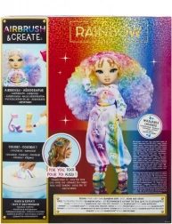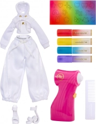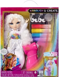 Ta kreatywna lalka jest jak czyste płótno – całkowicie biała, z białymi włosami i strojem przygotowanym na Twoją fantazję. W zestawie znajdziesz cztery zmywalne tęczowe flamastry (czerwony, żółty, niebieski, fioletowy) oraz praktyczny airbrush do łatwego cieniowania i równomiernego nanoszenia koloru.