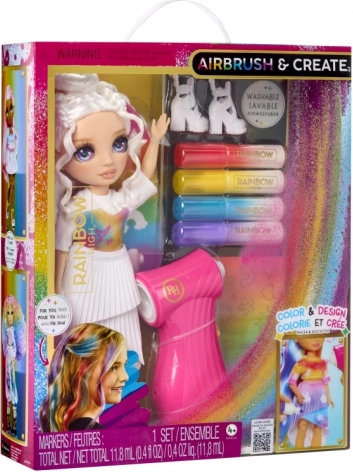 - 1 modna lalka w bieli, 1 aplikator airbrush (na sprężone powietrze), zmywalne markery (czerwony, żółty, niebieski, fioletowy)