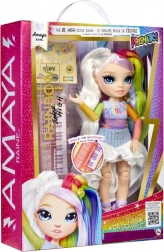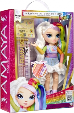 Amaya Raine z serii Rainbow High Jr. High wprowadza dzieci w świat mody i muzyki w jednej uroczej lalce. Dzięki długim tęczowym włosom, dopracowanemu strojowi i stawom jest gotowa na koncerty, sesje zdjęciowe i ekspozycję na półce. Akcesoria, w tym mini klawisze, wspierają zabawę w muzyczną gwiazdę.