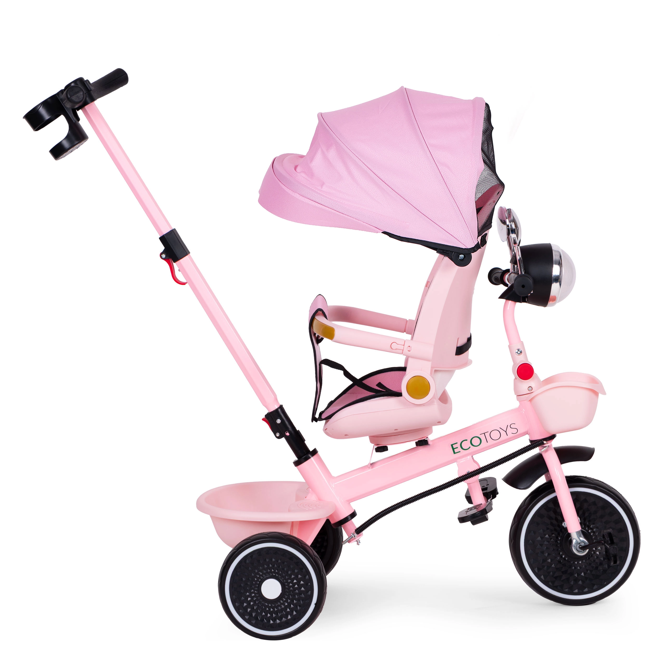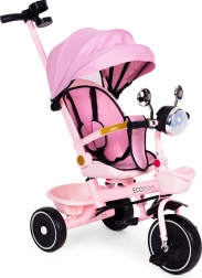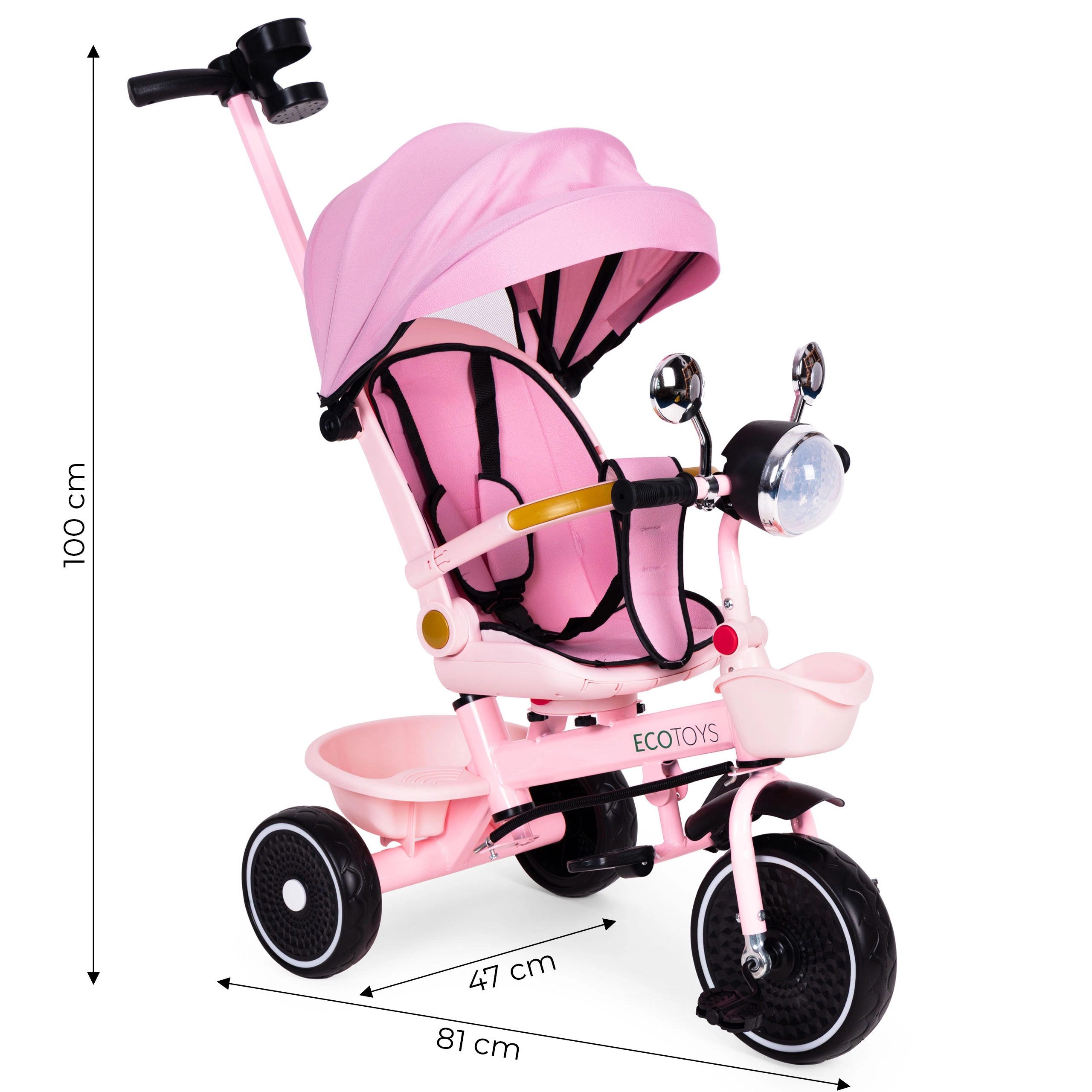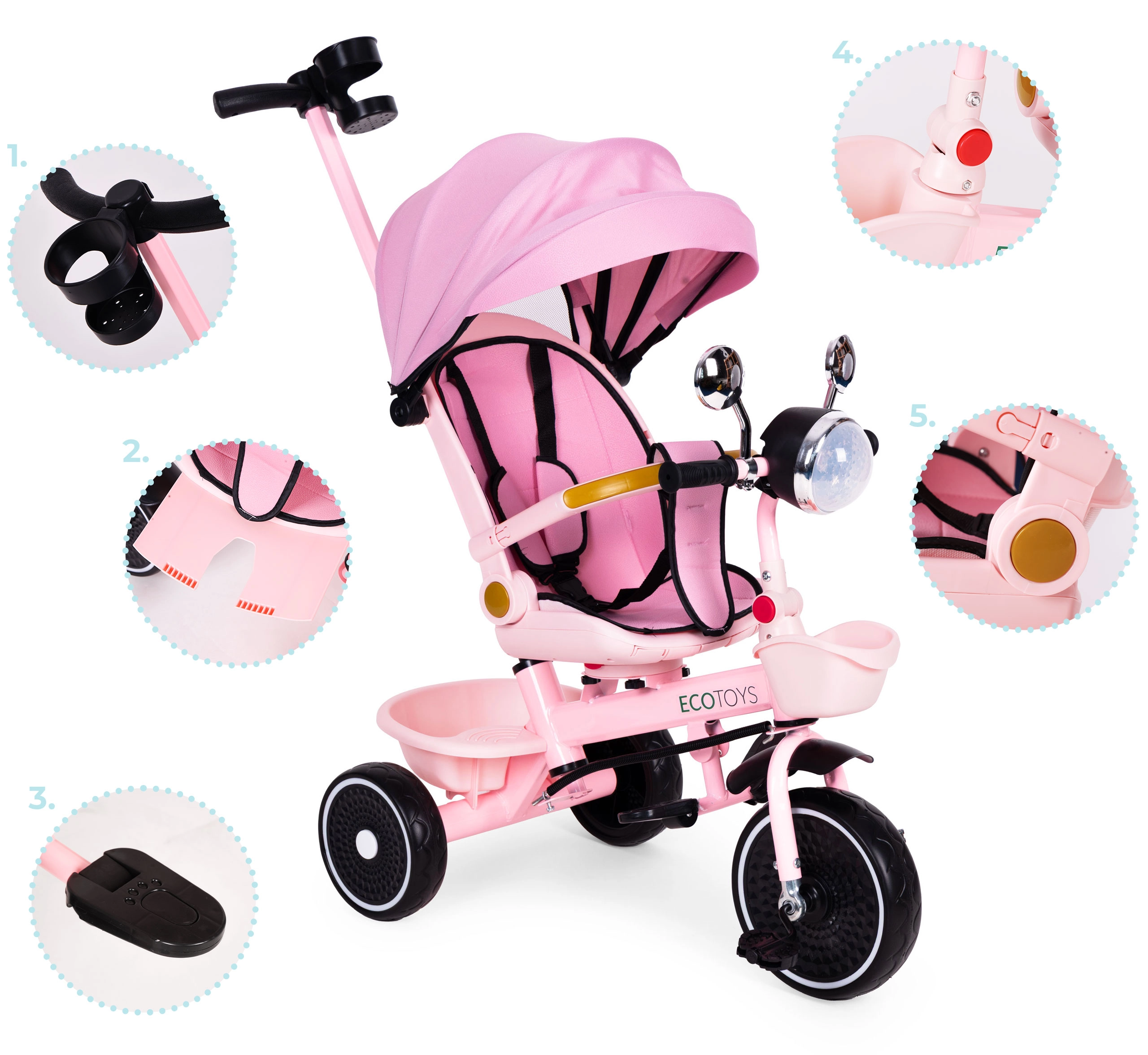 Stylowy różowy trójkołowy wózek ECOTOYS łączy wygodę wózka i radość z jazdy na trójkołowcu. Oferuje obrotowe siedzisko 360°, rodzicielski drążek prowadzący ze sterowaniem przedniego koła, składaną budkę, pięciopunktowe pasy bezpieczeństwa oraz trwałe koła EVA dla płynnej i bezpiecznej jazdy od 6 miesięcy do 6 lat.