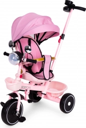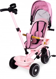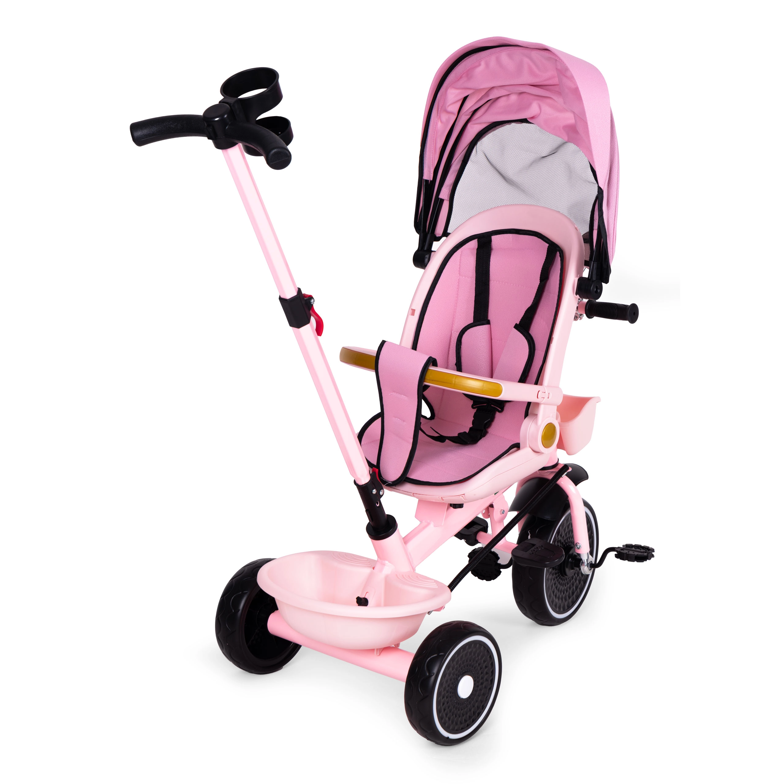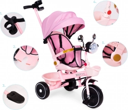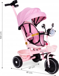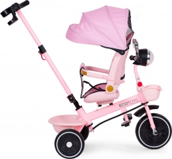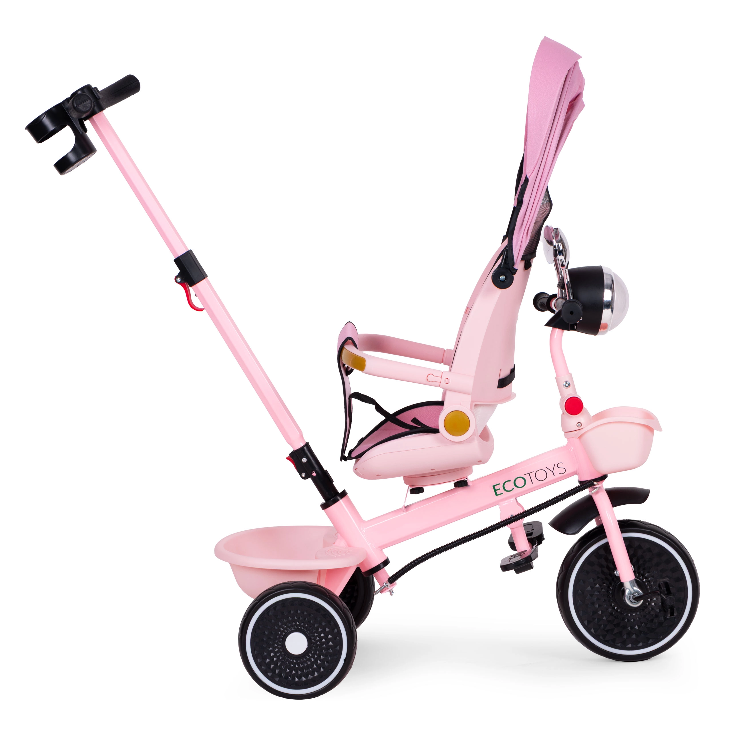 Stylowy różowy trójkołowy wózek ECOTOYS łączy wygodę wózka i radość z jazdy na trójkołowcu. Oferuje obrotowe siedzisko 360°, rodzicielski drążek prowadzący ze sterowaniem przedniego koła, składaną budkę, pięciopunktowe pasy bezpieczeństwa oraz trwałe koła EVA dla płynnej i bezpiecznej jazdy od 6 miesięcy do 6 lat.