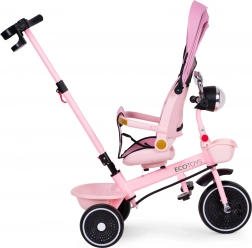 różowy dziecięcy trójkołowy wózek z obrotowym siedziskiem i drążkiem prowadzącym ECOTOYS