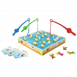 - 30 kolorowych rybek, podstawka do łowienia rybek, 3 kolorowe wędki (zielona, niebieska, czerwona), 28 kart z 56 zadaniami, instrukcja