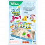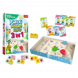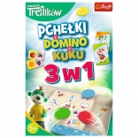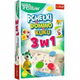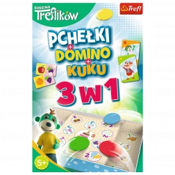 Rodzinny zestaw gier 3 w 1 oferuje Domino, lubianą grę Pchełki oraz karcianą klasykę Kuku z postaciami z bajki Rodzina TREFLIKÓW. Czeka was szybka i wciągająca zabawa z prostymi zasadami, które rozwijają zręczność, cierpliwość i zdrową rywalizację. Kompaktowe pudełko, które jednocześnie służy jako tarcza do pchełek, jest idealne w podróż.