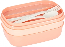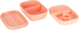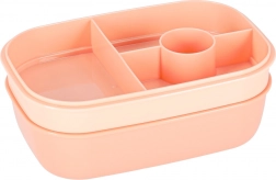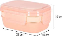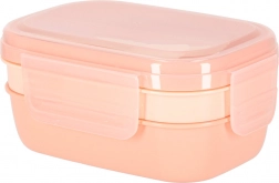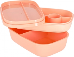 Trójpoziomowa konstrukcja z 8 przegródkami umożliwia zapakowanie osobno dania głównego, dodatków i przekąski. Cztery klipsy mocno zamykają pokrywkę z silikonową uszczelką, dzięki czemu zawartość pozostaje bezpieczna także w torbie. Morelowy kolor nadaje nowoczesny wygląd.