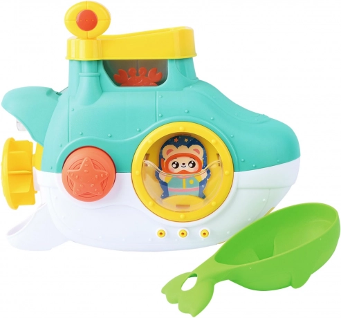 Ta kolorowa łódź podwodna do wanny łączy zabawę i naukę. Za pomocą dołączonej łopatki wlej wodę do górnej części i obserwuj, jak uruchamiają się ruchome elementy, a woda zaczyna płynąć. Praktyczne przyssawki zapewniają stabilne trzymanie na gładkich powierzchniach wanny lub płytek.