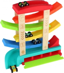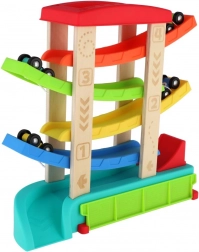 Ten kaskadowy tor wyścigowy łączy mocne drewniane słupki i trwałe plastikowe rampy w żywych barwach, które pobudzają dziecięcą ciekawość i percepcję wzrokową. Dzieci rozwijają małą motorykę, koordynację ręka–oko oraz zrozumienie przyczyny i skutku podczas obserwowania jazdy samochodzików.