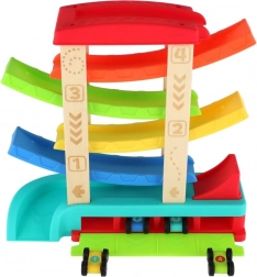Wystarczy umieścić jeden z 4 dołączonych samochodzików na starcie i patrzeć, jak dzięki grawitacji stopniowo pokonuje kolejne poziomy aż do mety. Wymiary 33 × 32 × 10 cm zapewniają idealny rozmiar do zabawy na stole i na podłodze, a zaokrąglone krawędzie i stabilna podstawa gwarantują bezpieczeństwo.