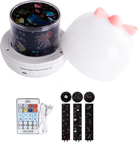 Ten dziecięcy projektor z lampką nocną tworzy kojącą atmosferę do zasypiania oraz radosną dekorację w ciągu dnia. Dzięki 6 różnym scenom projekcyjnym (urodziny, drewniany konik, Święty Mikołaj, morski park dinozaurów, rakieta i UFO, park zwierząt) dziecko może każdego dnia przeżywać inną opowieść. Lampka łatwo zmienia się z projektora gwiazd w spokojne światło nocne po zdjęciu wewnętrznych membran i zamknięciu górnej pokrywy.