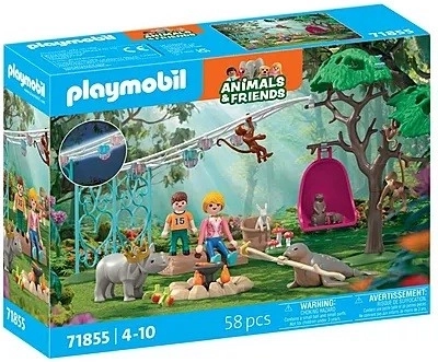 Mały nosorożec obchodzi urodziny i wszyscy są zaproszeni! Foka przygotowuje nad ogniem pyszne pieczone jabłka, króliczek odpoczywa po wesołych wyścigach, a goście zbierają się pod girlandą, która świeci w ciemności. Zestaw PLAYMOBIL oferuje mnóstwo możliwości kreatywnej zabawy w dzień i w nocy.