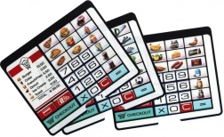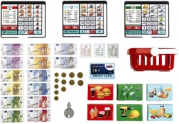 - Koszyk na zakupy, zabawkowa karta płatnicza, papierowe banknoty i monety, karty produktowe/kodowe