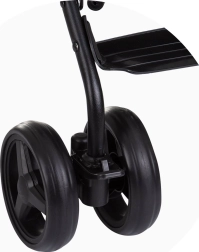 - Bezpieczeństwo: 5‑punktowe pasy z wyściółką, tylne koła z połączonym hamulcem
