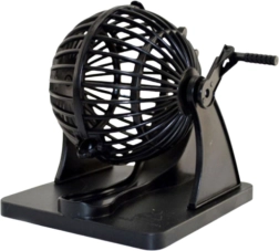 - Czarna maszyna losująca, żółte ponumerowane kulki