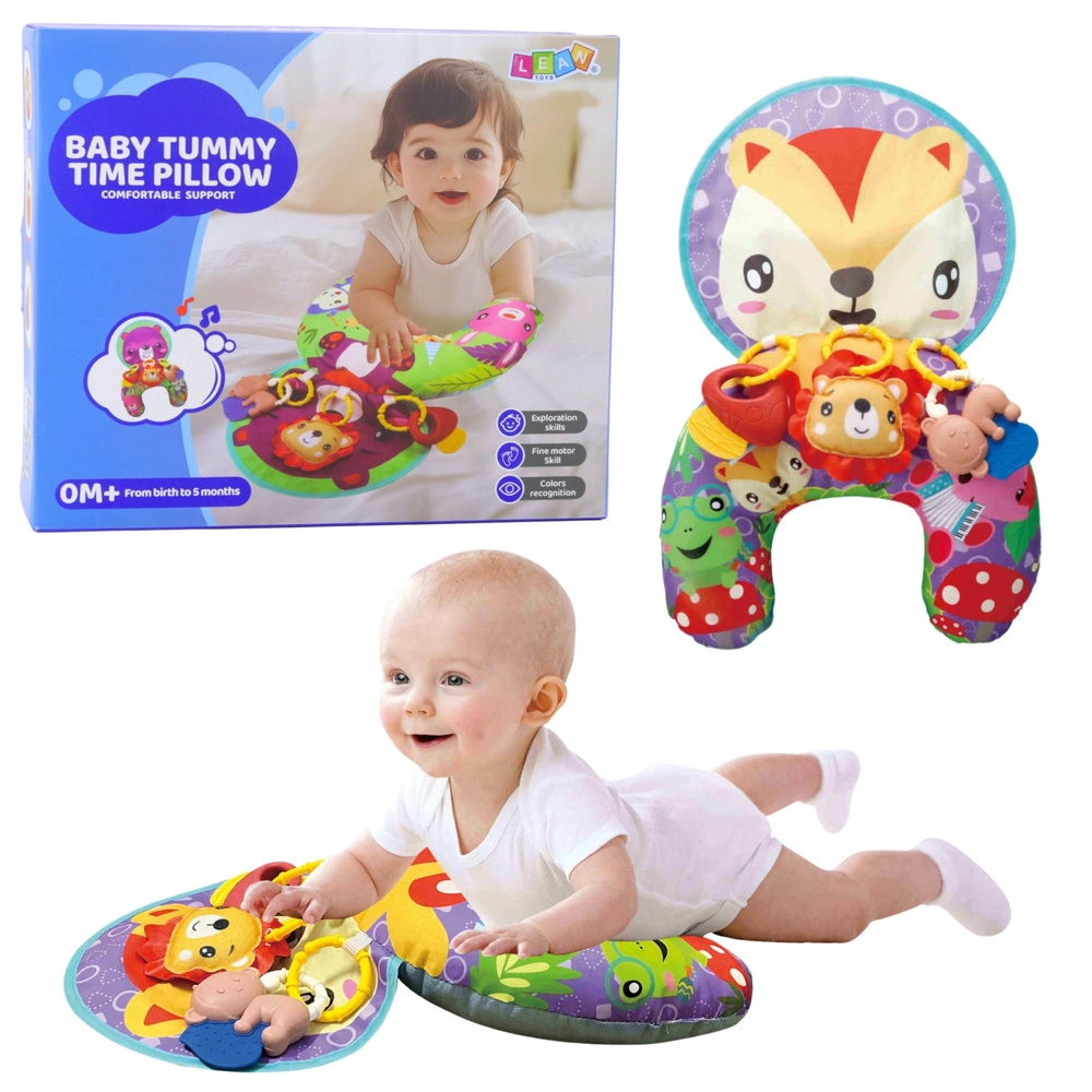 Miękka poduszka podpierająca dla niemowląt z 3 zawieszkami i szeleszczącą matą z liskiem. Wspiera leżenie na brzuszku, rozwój motoryki i stymulację sensoryczną.