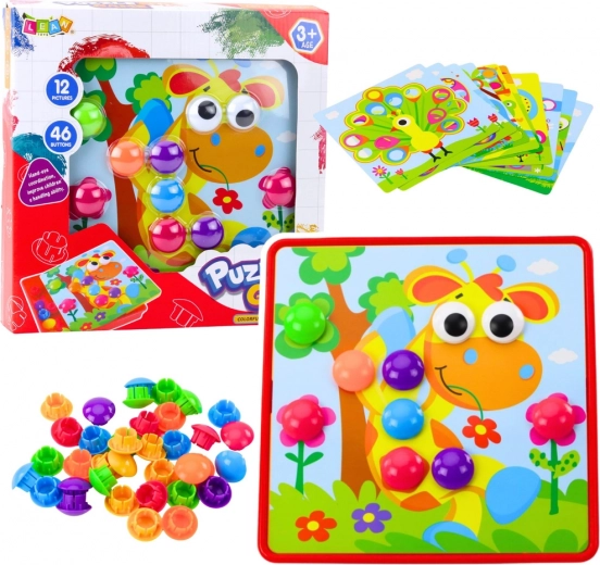 Odkryj zabawną i edukacyjną grę dla najmłodszych – kreatywną mozaikę z guzików. Dzieci wkładają kolorowe „grzybkowe” guziki w otwory na obrazkowych szablonach i tworzą własne kompozycje. Dzięki temu w naturalny sposób rozwijają małą motorykę, koordynację oko–ręka, koncentrację oraz rozpoznawanie kolorów. Bezpieczne materiały, zaokrąglone kształty i praktyczny organizer czynią z niej świetny wybór od 3. roku życia.