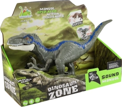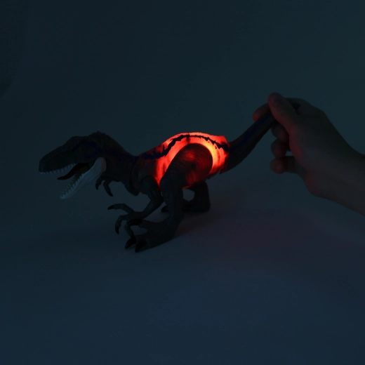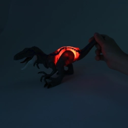 Ten szczegółowo wykonany dinozaur Velociraptor zapewnia dzieciom autentyczne wrażenia z prehistorii. Po naciśnięciu ogona uruchamia groźny ryk, a jednocześnie włącza się efekt świetlny, który potęguje dramatyczną atmosferę zabawy. Naciśnięcie głowy otwiera paszczę i wprawia w ruch przednie kończyny, dzięki czemu akcja nigdy się nie kończy.