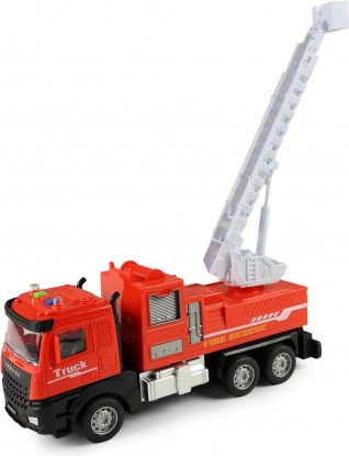 Wóz strażacki na napęd cierny, długość 25 cm, ze światłem i dźwiękiem. Baterie 3× AG13 w zestawie. Świetna zabawka do realistycznych akcji ratunkowych.