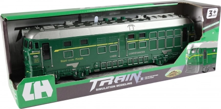 Zielona lokomotywa ze światłem, dźwiękiem i projektorem. Napęd bezwładnościowy, długość 33 cm. Baterie AG13 w zestawie – gotowe do natychmiastowej zabawy.
