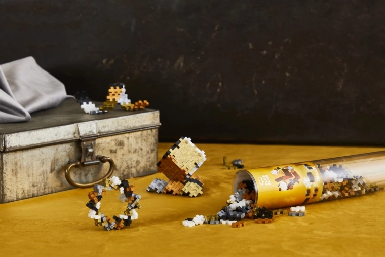 Plus-Plus Skarb w tubie: 100 elementów w kolorach złotym, srebrnym, miedzianym, czarnym i perłowym. Kreatywna układanka z plastiku z recyklingu, wyprodukowana w Danii, od 5 lat.