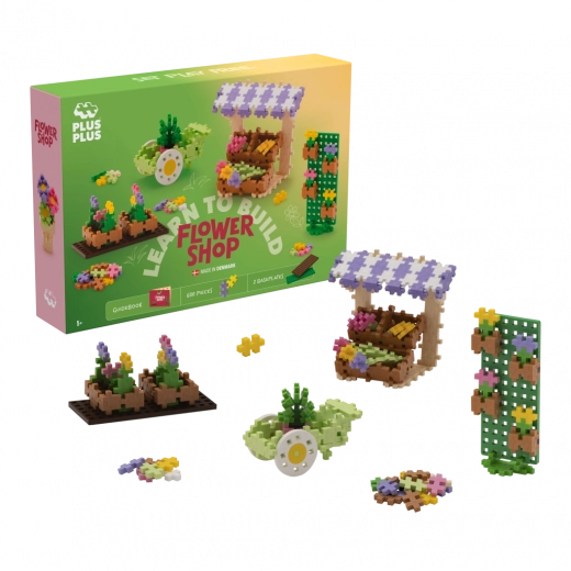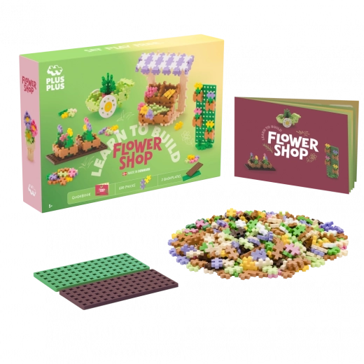 Zestaw Plus-Plus Naucz się budować Kwiaciarnię daje dzieciom nieskończone możliwości tworzenia. Dzięki 600 elementom i dwóm podkładkom nawet początkujący krok po kroku zbudują kolorowe stoisko, mobilny wózek lub efektowne kwiatowe dekoracje. Unikalny kształt elementów wspiera małą motorykę, wyobraźnię przestrzenną i rozwój kreatywności.