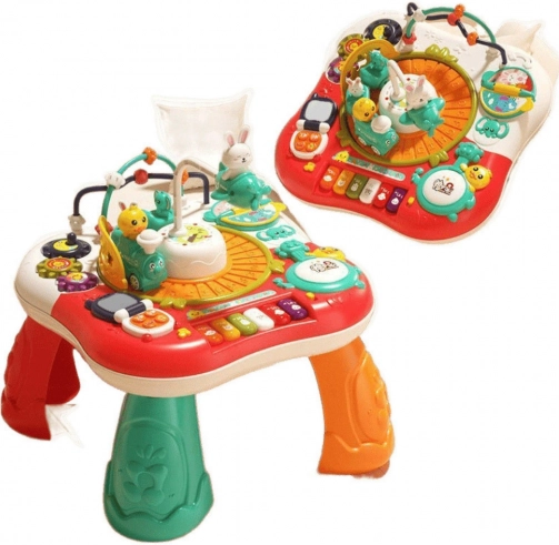 Stolik można używać jako klasyczny stojący stolik lub jako płaski panel edukacyjny – dzięki odpinanym nogom łatwo dopasowuje się do wieku dziecka i przestrzeni. Centrum zabawy stanowi ruchomy króliczek, który stymuluje uwagę i koordynację ręka–oko, a pianinko i bębenek urozmaicają zabawę wesołymi melodiami i dźwiękami.