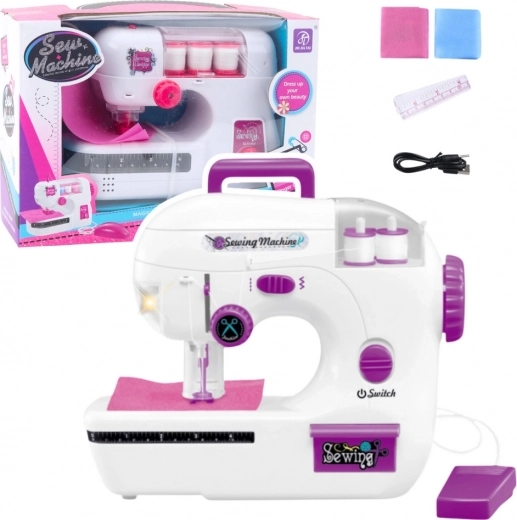 Maszyna naprawdę szyje – tkaninę można przesuwać za pomocą pedału lub ręcznego pokrętła. Do dyspozycji jest podświetlenie pola pracy, podajnik z unoszeniem stopki oraz realistyczne dźwięki, które potęgują wrażenia. Igła jest chroniona plastikową osłoną, dzięki czemu zabawa jest bezpieczniejsza także dla początkujących.