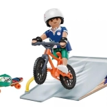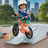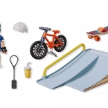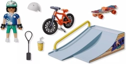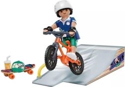 Ten zestaw prezentowy PLAYMOBIL jest idealny dla małych miłośników adrenaliny. Figurka ma sprytne uchwyty na stopach, dzięki czemu trzyma się pewnie na skateboardzie i na rowerze BMX – gotowa na skoki i triki na trzyczęściowej rampie. Świetne detale, takie jak kask lub czapka, słuchawki z odtwarzaczem MP3 oraz napój dopełniają autentyczną atmosferę skateparku.
