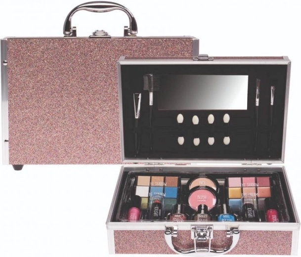 Stylowy średniej wielkości kuferek kosmetyczny z brokatowym wykończeniem do przejrzystego przechowywania i łatwego przenoszenia Twoich akcesoriów. Idealny do użytku domowego i w podróży, z wystarczającą ilością miejsca na makijaż i dodatki. Praktyczny, wytrzymały i elegancki pomocnik do codziennej organizacji kosmetyków.