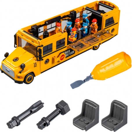 Żółty szkolny autobus do skręcania i rozkręcania ucieszy małych techników i miłośników pojazdów. Oferuje 48 elementów, napęd cierny na tylne koła, efekty świetlne i dźwiękowe oraz praktyczny śrubokręt z wymiennymi końcówkami. Otwierane drzwi i okna, gumowe koła oraz wysokiej jakości plastik ABS gwarantują trwałość i realistyczną zabawę.