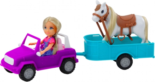 - Terenowy kabriolet z przyczepą, lalka ok. 13 cm, koń z siodłem i uzdą