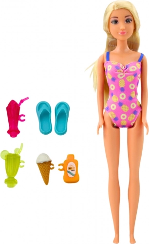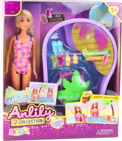 Lalka ANLILY na plaży przenosi do dziecięcego pokoju atmosferę beztroskich wakacji. Stylowy plażowy strój, kolorowe dodatki oraz kompaktowy basen ze zjeżdżalnią i palmą tworzą idealną scenę do wymyślania letnich historii.