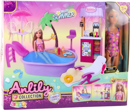 Ciesz się letnią zabawą z lalką ANLILY w kolorowych strojach kąpielowych i bogatym zestawem akcesoriów. W komplecie znajdują się basen z palmą i zjeżdżalnią, leżak, parasol ze stolikiem i krzesełkiem oraz stoisko z napojami do kreatywnej zabawy na „tropikalnej plaży”. Doskonałe do rozwijania wyobraźni, motoryki małej i zabawy w odgrywanie ról.