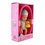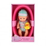Laleczka w wanience z żółtą kaczuszką tworzy gotową scenę do zabawy w odgrywanie ról i codzienne rytuały opieki nad niemowlęciem.
