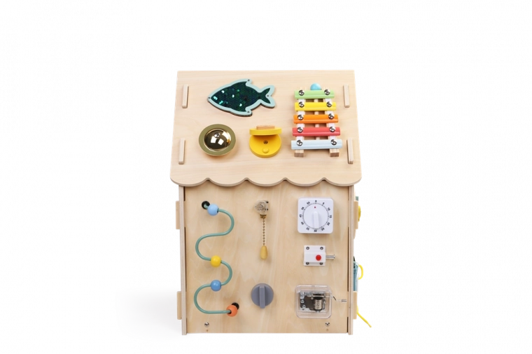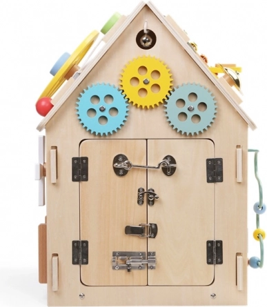 Odkryj drewniany aktywny domek pełen zabawy i nauki dla dzieci od 3 lat. Każda strona oferuje interaktywne elementy, które rozwijają małą motorykę, logiczne myślenie oraz percepcję sensoryczną. Dzieci pokochają kierownicę i dźwignię zmiany biegów, zębate kółka, labirynt z kuleczką, liczydło oraz trening zamków, suwaka, guzika i sznurowadeł. Bezpieczne wykonanie z wysokiej jakości naturalnego drewna i nietoksycznych farb.