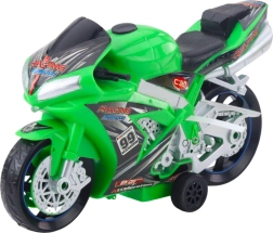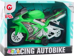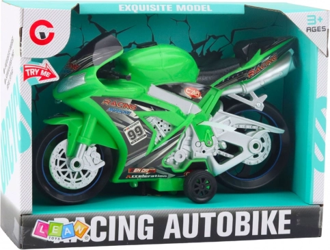 Ten zielony wyścigowy motocykl ucieszy wszystkich małych miłośników prędkości i sportów motorowych. Wykonany z wytrzymałego plastiku, ma stabilną podstawę i szerokie koła, które zapewniają pewną jazdę po różnych nawierzchniach. Po naciśnięciu przycisku uruchamiają się efekty świetlne oraz realistyczne dźwięki silnika, potęgując wrażenia z zabawy.