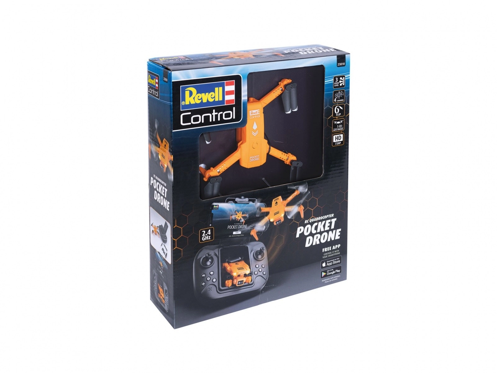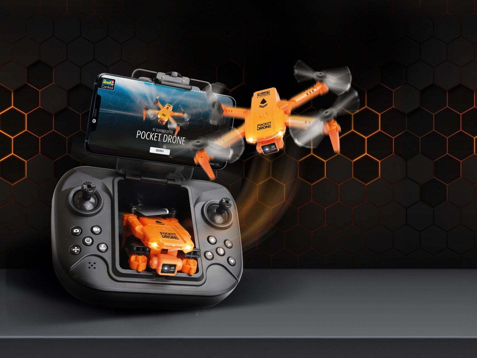 Kieszonkowy dron REVELL Control dostarcza mnóstwo zabawy w małym rozmiarze. Dzięki długości 110 mm, szerokości 134 mm i wysokości 35 mm wygodnie mieści się w schowku w kontrolerze i jest zawsze gotowy do lotu. Wbudowana kamera 720p przesyła podstawowe zdjęcia i wideo na żywo do Twojego smartfona, dzięki czemu zobaczysz świat z nowej perspektywy.