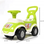 Nacisk na bezpieczeństwo i stabilność uzupełnia szeroki rozstaw kół, gładkie krawędzie i trwałe materiały, bez potrzeby użycia baterii. Kolorowa kierownica z klaksonem i panel z „zegarami” wprowadzają dzieci w świat kierowania i wspierają poczucie równowagi, koordynację oraz samodzielność.
