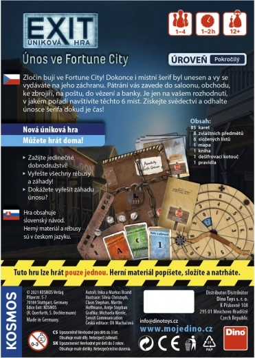 Wyrusz na Dziki Zachód i rozwikłaj tajemnicę zniknięcia szeryfa w grze EXIT: Porwanie w Fortune City. Czeka na ciebie porywająca fabuła, logiczne zagadki i kooperacyjna zabawa dla 1–4 graczy od 12 lat. Czy zdołacie znaleźć winnego, zanim pociąg odjedzie?