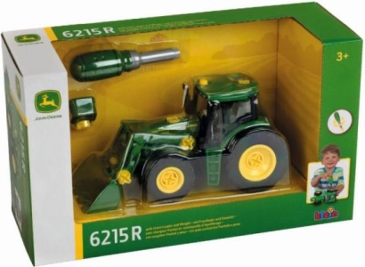 Zestaw do składania John Deere 6215 R w skali 1:24 z ładowaczem czołowym i przeciwwałem. Łatwy montaż, realistyczne detale, świetna zabawa i model kolekcjonerski.