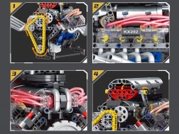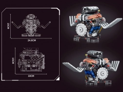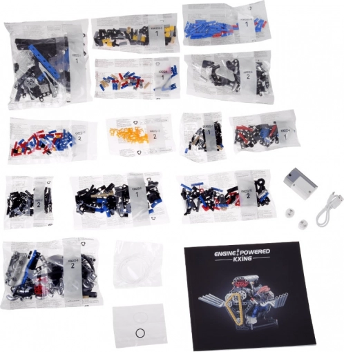 W zestawie znajdują się ponumerowane woreczki ułatwiające orientację, kabel USB do ładowania oraz przejrzysta instrukcja obrazkowa. Efektowne czerwone światło nadaje modelowi imponujący wygląd i podkreśla ruchome części.
