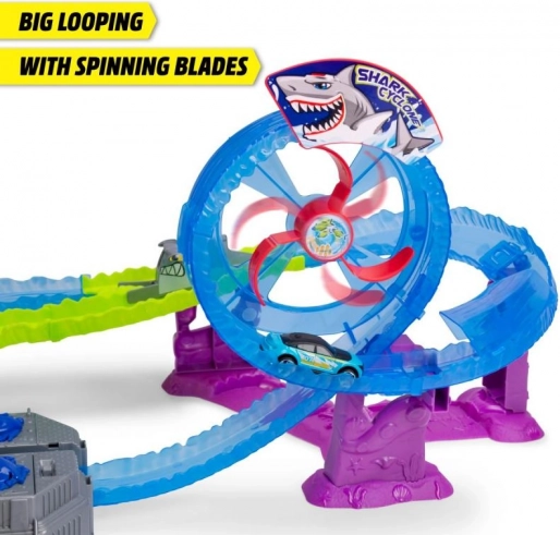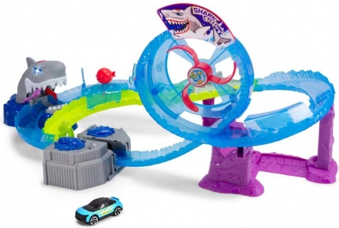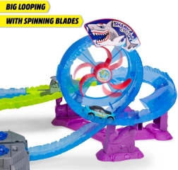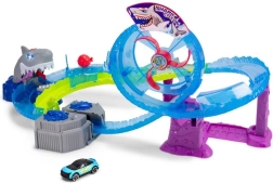 Zabawna autodroga z motywem WHITE SHARK zapewnia emocjonującą jazdę z pętlą, turbo boosterem oraz imponującymi efektami świetlnymi i dźwiękowymi. Metalowy samochodzik w zestawie, efektowny przejazd przez wodny tunel i niespodziewane zaciśnięcie szczęk wielkiego żarłacza białego.
