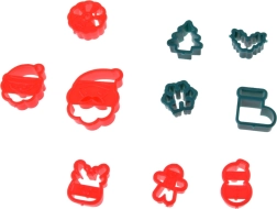• 10 świątecznych foremek: bałwanek, pierniczek, renifer, duża głowa Mikołaja, mała głowa Mikołaja, świąteczny wieniec, śnieżynka, but Mikołaja, choinka, jemioła