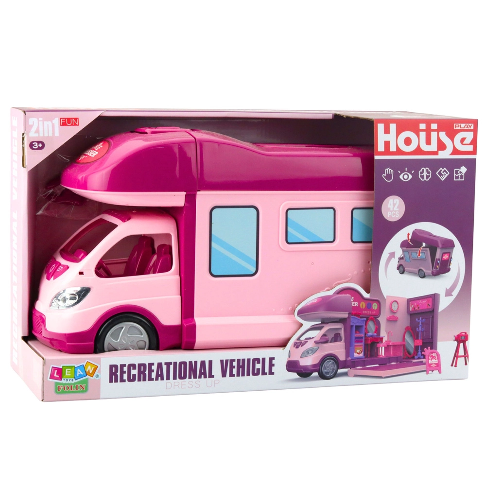 Duży różowo‑fioletowy kamper po rozłożeniu zamienia się w przytulny domek dla lalek, który pobudza dziecięcą wyobraźnię i kreatywną zabawę. Bogaty zestaw akcesoriów pozwala na dowolne aranżowanie wnętrza dokładnie według pomysłu dziecka.