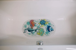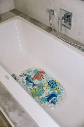 Montaż jest prosty: dla idealnej przyczepności napełnij wannę wodą, umieść matę na dnie i równomiernie dociśnij. Dzięki uniwersalnym wymiarom 69 × 39 cm pasuje do większości wanien i dziecięcych wanienek.