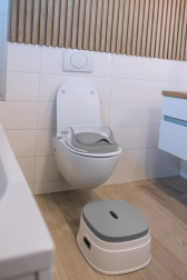 W zestawie znajduje się wyjmowana wewnętrzna miska do łatwego i szybkiego czyszczenia, zdejmowana nakładka na WC do użytku na standardowej toalecie oraz praktyczny stopień z bocznymi uchwytami, który pomaga dziecku dosięgnąć do umywalki lub wyżej położonych miejsc.