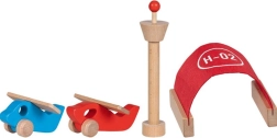 - W zestawie akcesoria: 2 drewniane samoloty, wieża kontroli lotów i hangar