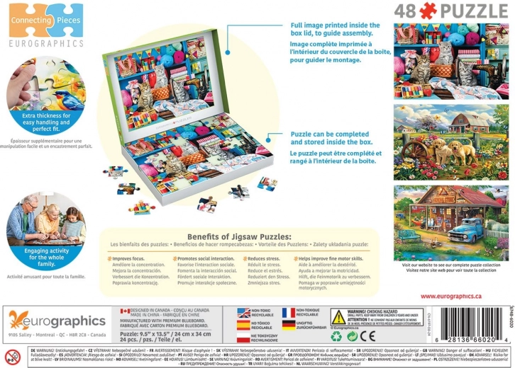 Ciesz się spokojnym układaniem z kolekcją puzzli Connecting Pieces od EUROGRAPHICS. Duże elementy i motyw „Kocie dzierganie” wspierają umiejętności poznawcze, motorykę małą oraz koncentrację. Idealne dla seniorów oraz osób z ograniczoną sprawnością ruchową czy demencją. Opakowanie z odchylanym wieczkiem pozwala układać obrazek bezpośrednio w pudełku.