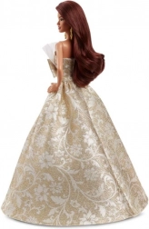 Ta świąteczna Barbie zachwyca długimi brązowymi włosami, okazałymi kolczykami i wspaniałą suknią inspirowaną modą balową. Obfita spódnica ze złocisto-białym wzorem, tiulowe detale i wyrazista kokarda wyglądają luksusowo i świetnie prezentują się zarówno podczas zabawy, jak i na półce.